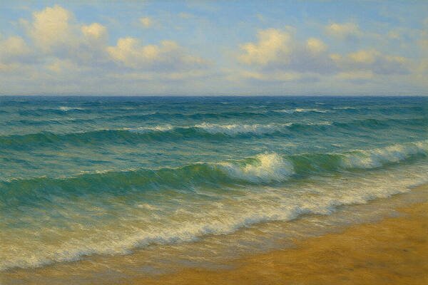 The quiet elegance of this seascape lies in its interplay of light, movement, and atmosphere. Soft turquoise waves rise and fall in gentle layers, each crest catching a hint of warm sunlight before dissolving into foam at the shoreline. The sand glows with golden undertones, grounding the composition and balancing the cool palette of the water. Above the horizon, soft clouds drift across a warm blue sky, adding depth and openness. The effect is meditative — a calm rhythm that feels timeless and intimate. This artwork is perfect for coastal homes, minimalist interiors, or personal retreat spaces, offering tranquility and luminous energy.