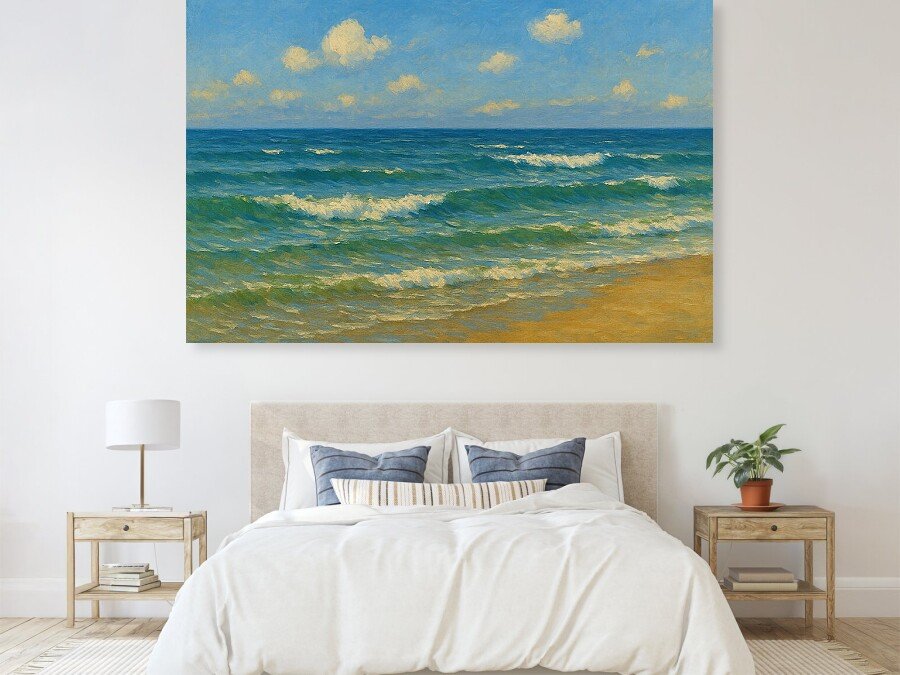 The painting reflects a classic Impressionist sensibility: expressive but controlled strokes, glowing light, and a calm emotional tone. Ideal for collectors seeking serene, restorative artwork, this piece blends realism with painterly warmth. Its harmonious palette makes it a perfect fit for coastal homes, modern interiors, wellness spaces, or anyone drawn to tranquil, ocean-inspired art.