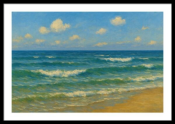 This seascape explores the quiet beauty of a sunlit shoreline, where soft turquoise waves roll toward warm sand beneath a luminous sky. Gentle cloud formations drift across the horizon, adding balance and atmosphere to the composition. Layered brushwork brings movement to the water, while subtle color transitions—from deep marine blues to pale greens in the shallows—create a natural depth that invites the viewer to linger.