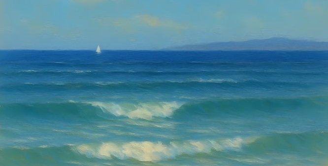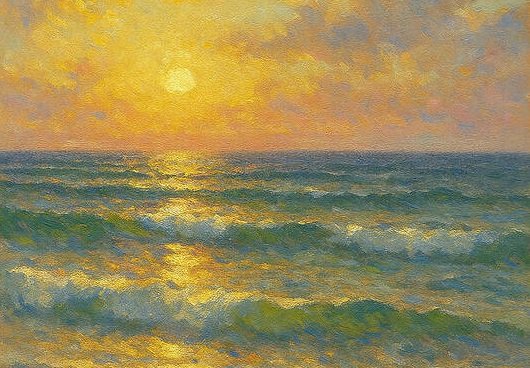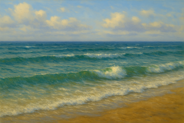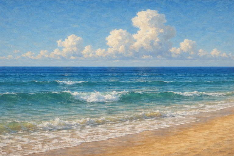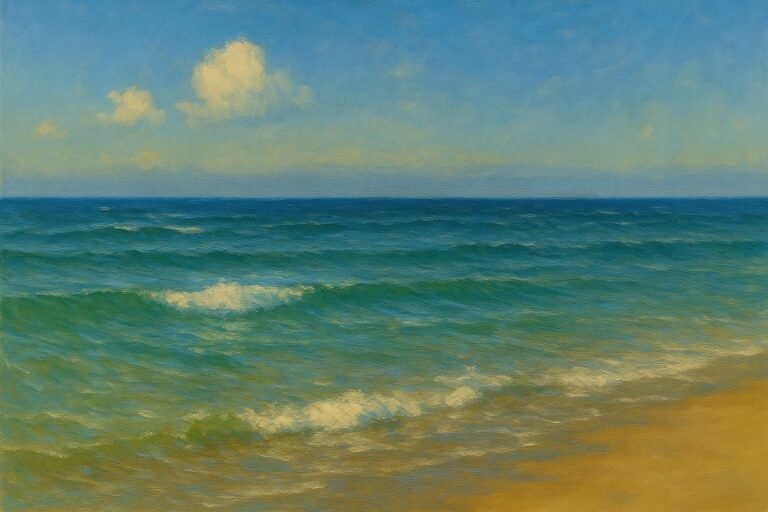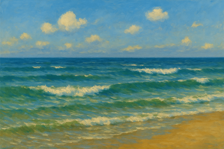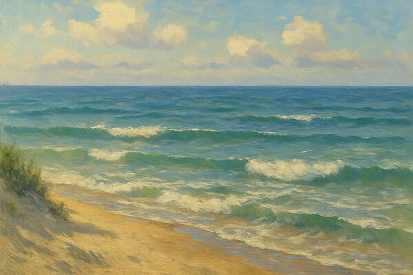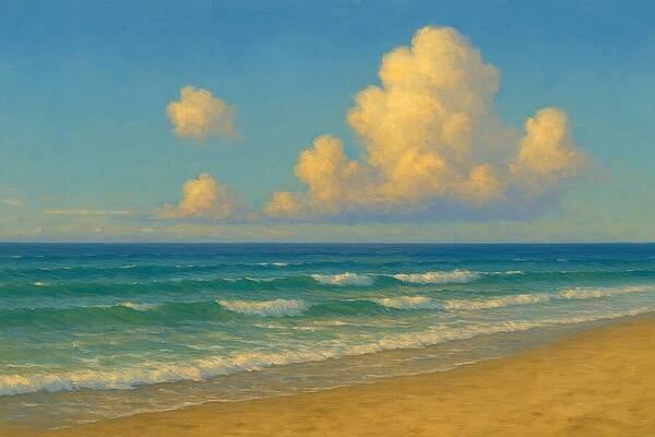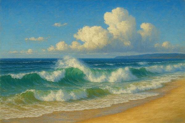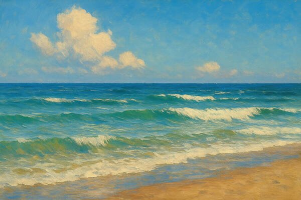 Ai Painting This radiant seascape captures the bright, uplifting rhythm of turquoise waves moving toward a sunlit shore. With a luminous sky and shimmering water, the scene blends warmth, clarity, and ocean-side tranquility — a perfect moment of calm preserved…