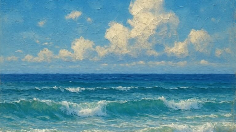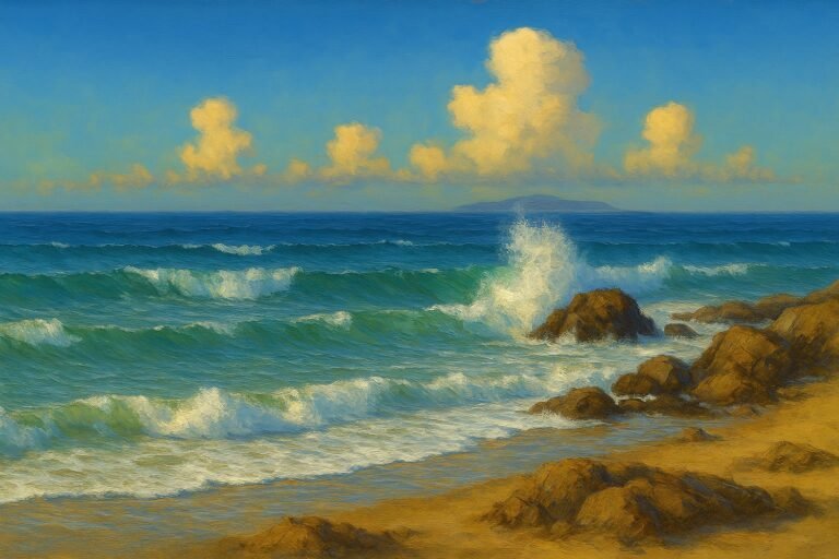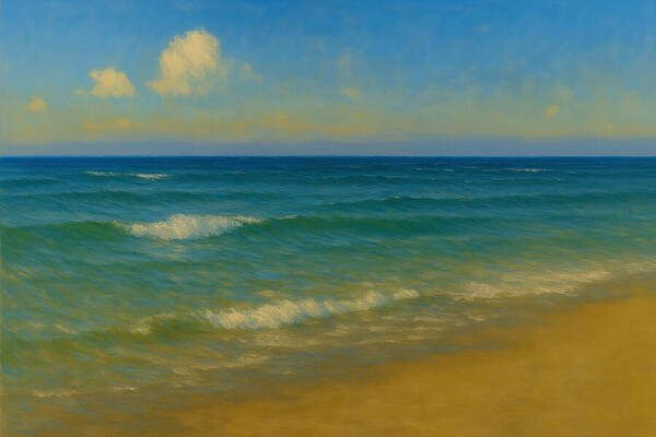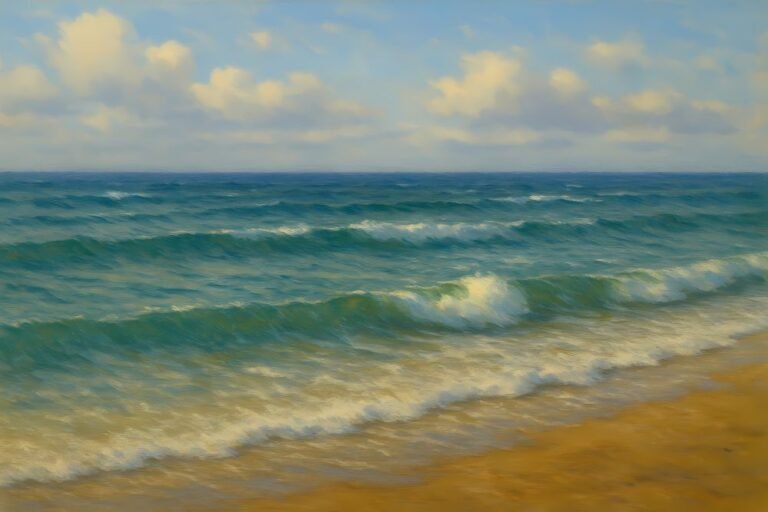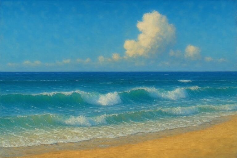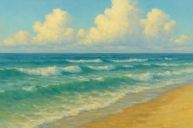 This seascape explores the quiet beauty of a sunlit shoreline, where soft turquoise waves roll toward warm sand beneath a luminous sky. Gentle cloud formations drift across the horizon, adding balance and atmosphere to the composition. Layered brushwork brings movement…