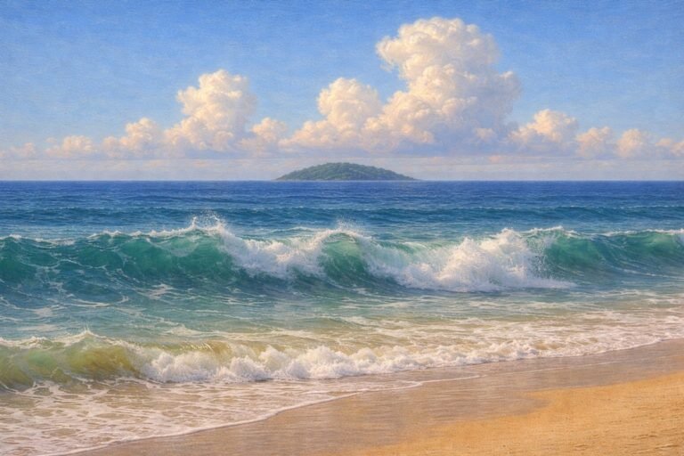 AI Painting ~~~ At dawn, the island hovered like a thought half-remembered. Each wave carried the shore a little closer, whispering promises it could never quite keep. I stood barefoot in the sand, certain that if I watched long enough,…